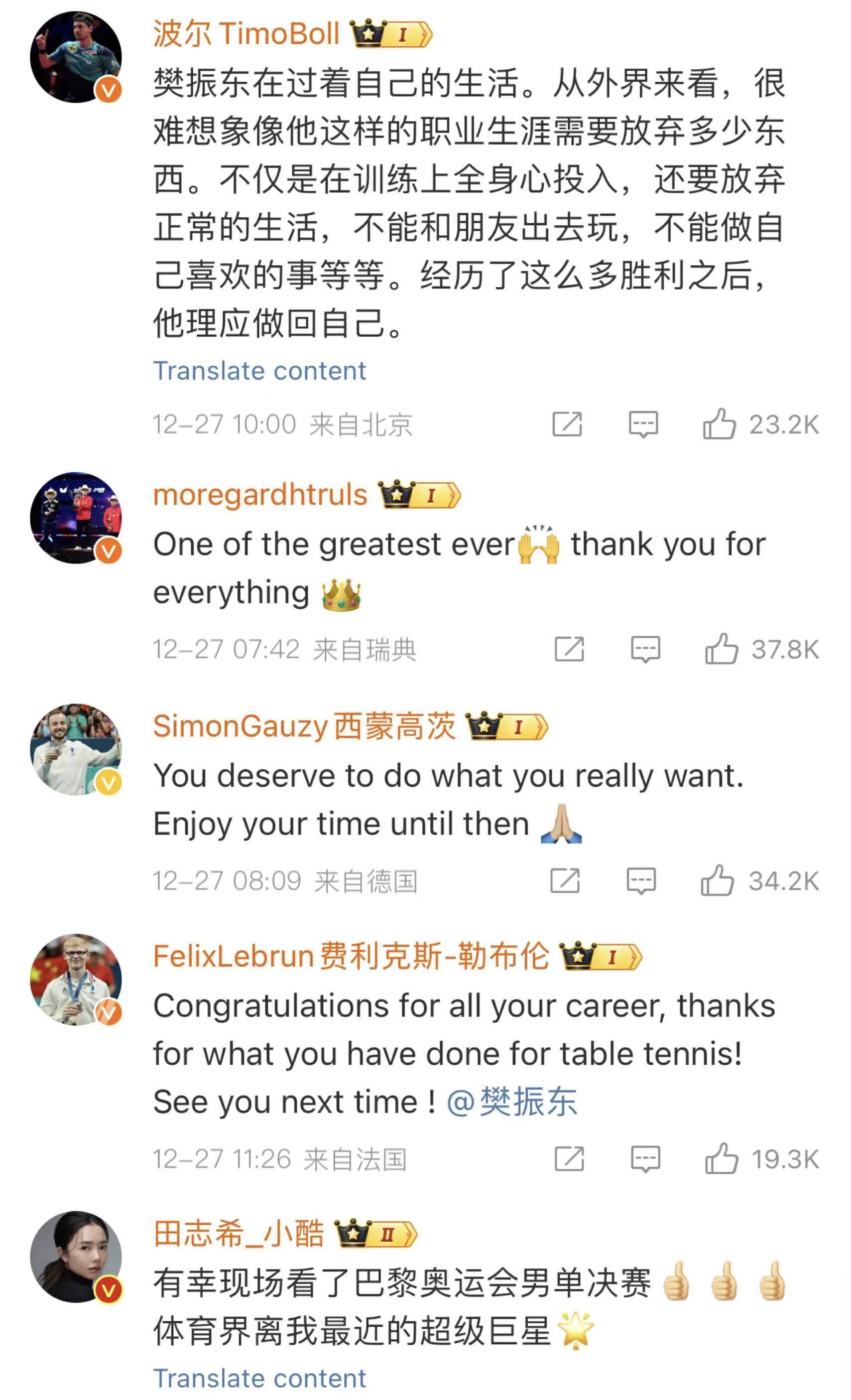 与吴敬平通常,不少外协乒乓球贯通员也先后在樊振东酬酢动态留言,饱读吹这位国乒超等大满贯朝着我方的料到打算陆续前行。德国名将波尔默示,但愿樊振东接下来能够过着我方念念要的生涯,作念回我方。奥恰洛夫默示,天然对樊振东的这一决定感到讶异,但依然充分尊重其遴荐。巴黎奥运男单亚军莫雷高德直呼樊振东是“有史以来最伟大的球员之一!”韩国名将田志希则直言:“超等巨星!”